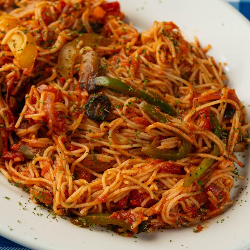 Angel hair with marinara sauce, onion, green pepper, mushroom, and tomato.