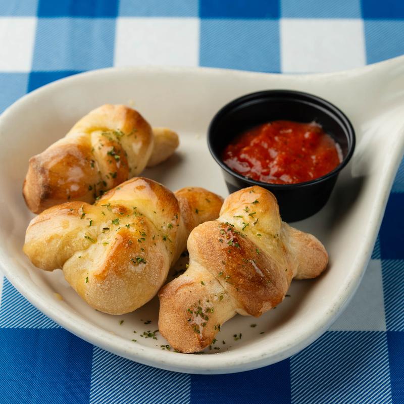 4 garlic bread knots topped with mozzarella cheese and pepperoni.