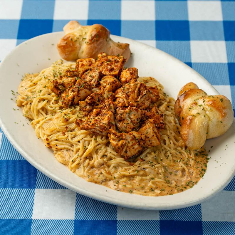 Cajun seasoned chicken, Alfredo sauce on angel hair.